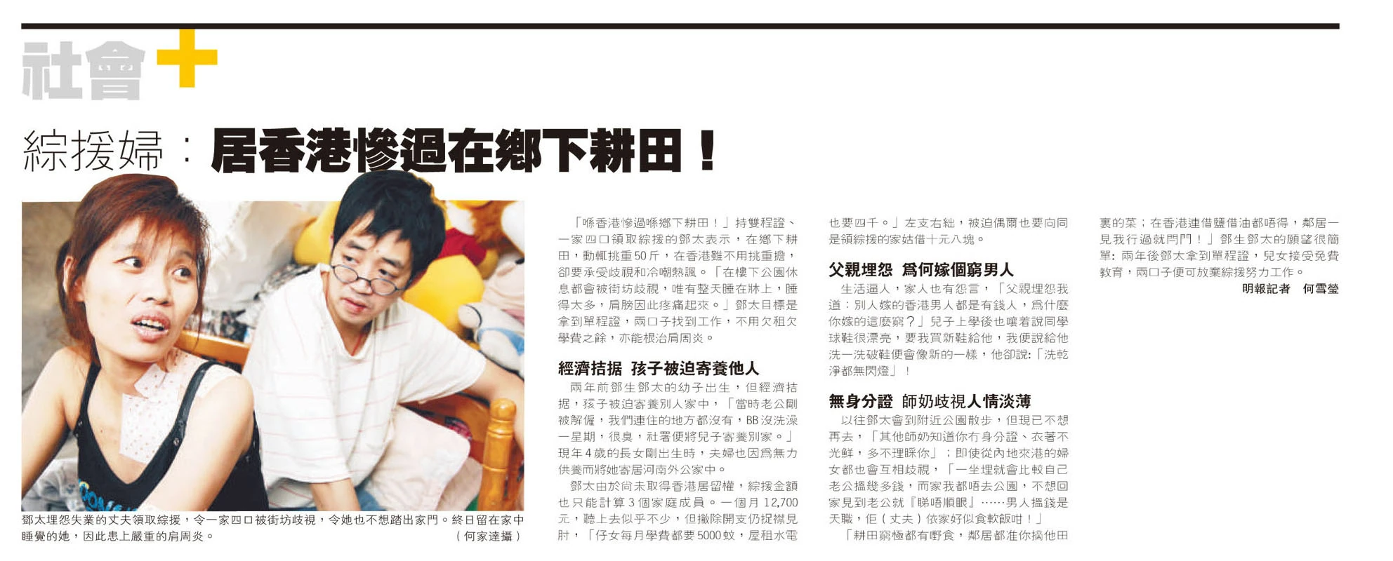 【明報專訊】「居香港慘過在鄉下耕田!」持雙程證、一家四口領取綜援的鄧太表示,在鄉下耕田,動輒挑重50斤,在香港雖不用挑重擔,卻要承受歧視和冷嘲熱諷。「在樓下公園休息都會被街坊歧視,唯有整天睡在床上,睡得太多,肩膀因此疼痛起來。」鄧太目標是拿到單程證 ,兩口子找到工作,不用欠租欠學費之餘,亦能根治肩周炎。