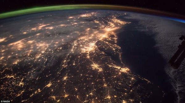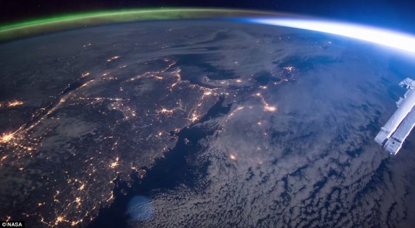 美國太空人巴瑞威瑪(Barry E. Wilmore)在駐守國際太空站期間,拍下北極光和日出光芒同時蹦生瞬間,畫面左方綠色北極光出現,隨後右方白光日出緩緩壯大,兩道光芒在美國本土維吉尼亞州、德拉瓦州、紐澤西州和麻薩諸塞州上方碰撞。