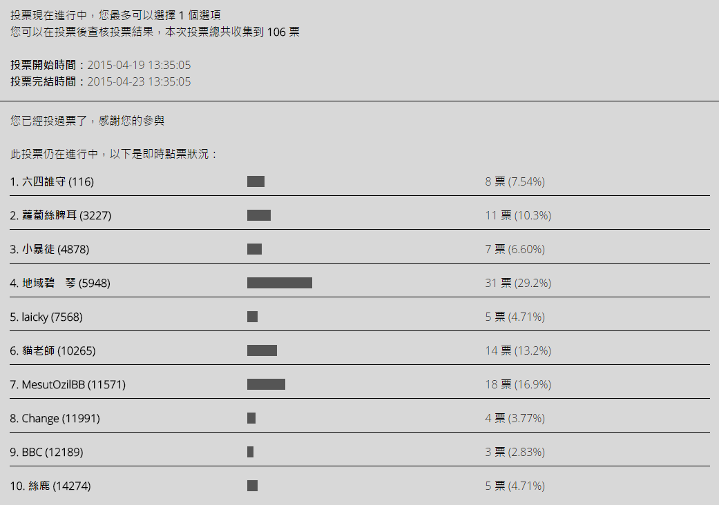 因為怕真係有人跟來投票,但以上同結果差不多, 因為都投左106票,結果不會再大變