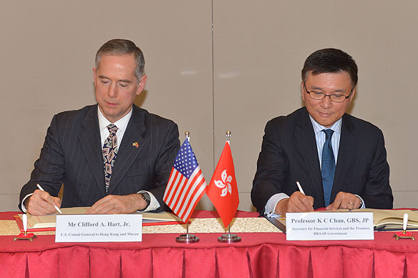 防止逃稅防止逃稅: 財經事務及庫務局局長陳家強(右)和美國駐港澳領事夏千福11月13日簽署《跨政府協議》。