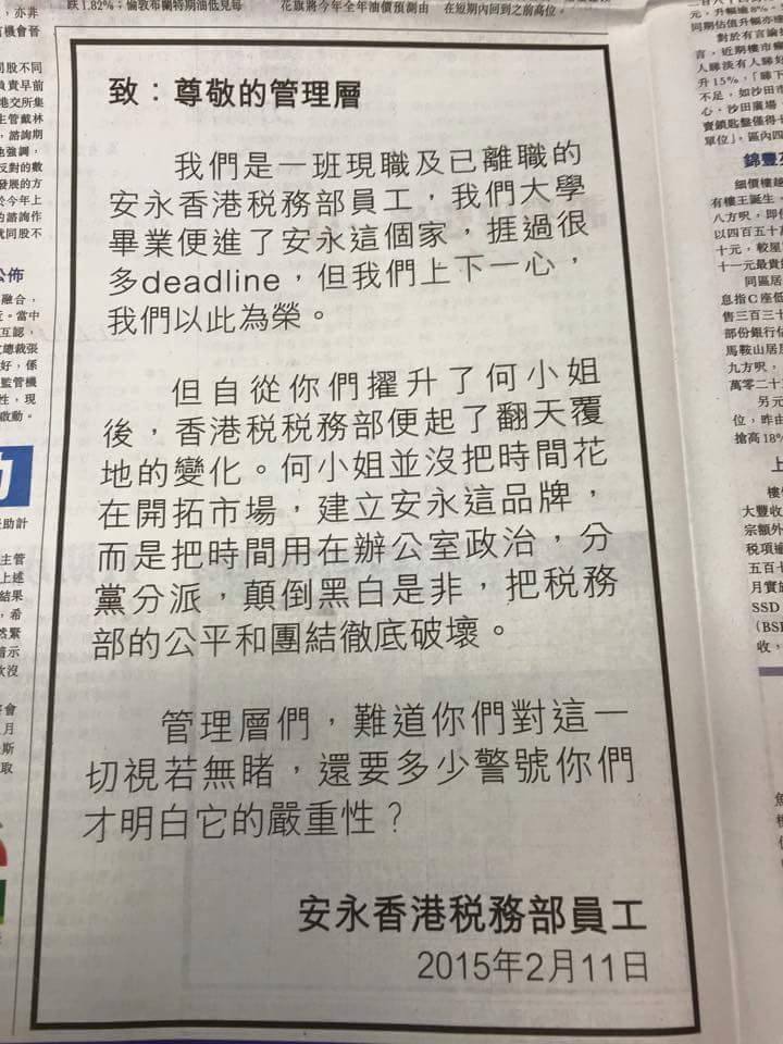 發表文章發起投票四大會計師員工登報 罵某合伙人「玩辦公室政治、不事生產」四大會計師員工登報 罵某合伙人「玩辦公室政治、不事生產」[/size=6][/b]四大會計師行之一的安永會計行爆出不和風波。今天《蘋果日報》刊登一則廣告,內容乃安永稅務部員工集體以「公開信」控訴安永一名合伙人名為「何小姐」,指她只專注「玩辦公室政治,分黨分派」,不事生產。文章尾段更指,安永高層「對一切視若無睹」。有安永的稅務部職員向本報透露,據稱確有員工不滿一名合伙人。有關文章已在網上廣泛流傳。http://news.mingpao.com/ins/四大會計師員工登報 罵某合伙人「玩辦公室政治、不事生產」/web_tc/article/20150211/s00002/1423627583451802015/02/11, 2:22:41 下午本貼文共有 0 個回覆此貼文已鎖,將不接受回覆發表文章發起投票