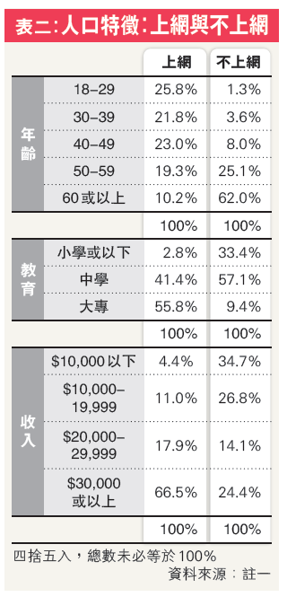 表二告訴我們,不能上網的人,是有共同的特徵——一般年紀較大,學歷和收入也較低。上網者中,30歲以下的年輕人佔逾四分之一,60歲或以上的長者只佔一成;但不上網者中,長者佔六成二,50至59歲的人也佔四分之一,30歲以下的不上網者更低至1.3%。再看教育方面。上網者逾五成半達大專程度,小學程度只佔2.8%;不上網者絕大部分是中小學程度,大專程度的佔不到一成。最後是收入方面。上網者收入明顯較高,逾六成半月入3萬或以上;不上網者中,月入少於1萬的有近三成半,而月入超過3萬的只有兩成四。由此推斷,資訊弱勢與一個人的社會和經濟條件有密切的關係。