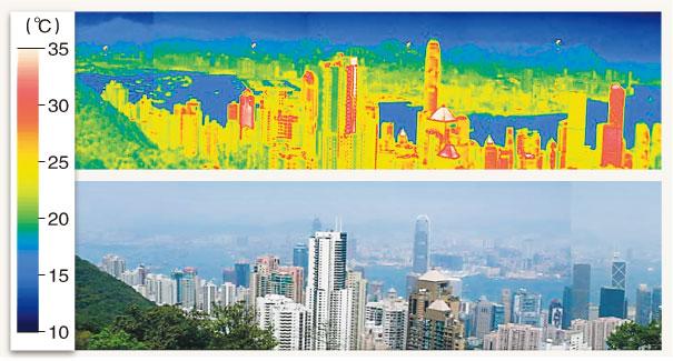 港大機械工程系研究團隊以紅外線相機拍照,顯示城市的溫度。其中一幅攝於2008年3月15日下午1時的照片顯示,市區表面較空氣溫度高出10℃,而山坡的氣溫亦較低,只有攝氏10多度左右。在陽光直射的市內區域,例如大廈外牆,由於日間迅速吸收大量熱能,故溫度迅速上升,最高達39℃(圖右的中銀大廈),與中環市中心的氣溫22℃,足足相差17℃。圖中所見,溫度以4種漸變的顏色顯示,藍色代表20℃以下,隨着氣溫上升,會變成綠色、黃色,30℃以上則為紅色。(港大機械工程系提供)