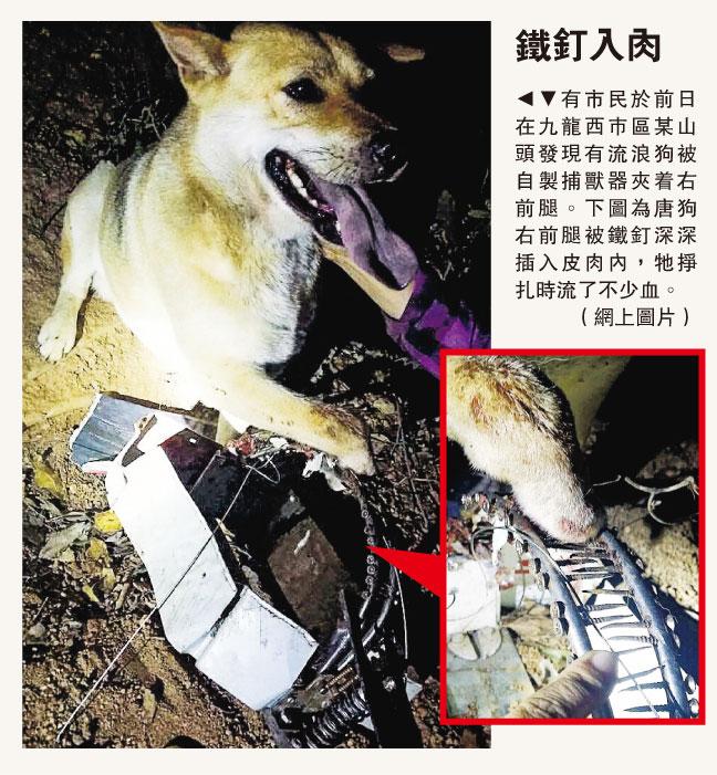 有網民前日在網上貼圖,指在山邊餵狗時聽到「好痛苦嘅哀聲」,其後發現一隻流浪唐狗被捕獸器夾着右前肢,該捕獸器由鐵片和鐵釘組成,相信是捕獵者自製,鐵釘深深插入唐狗皮肉,牠掙扎時流了不少血。貼圖的網民稱拉開捕獸器後,唐狗高速跑離現場。
