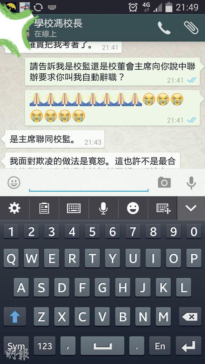 許麗明向本報記者展示她事後再詢問校長有關中聯辦叫她自動辭職的短訊,以證二人的對話中,確有談及中聯辦一事。