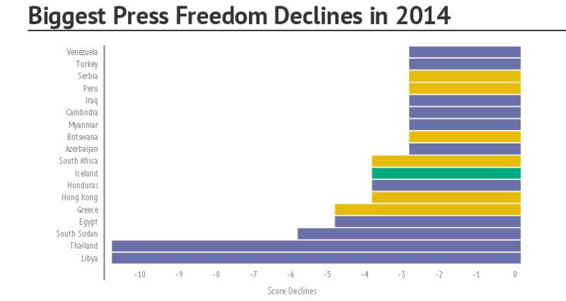 在零分為最好,100分為最差的計算下,2015年本港新聞自由度評分由去年37分下跌至41分,是新聞自由度倒退最嚴重國家及地區之一。