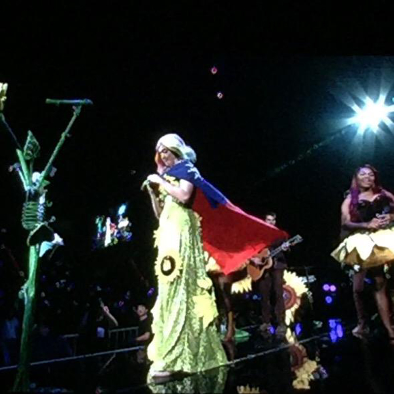 她在演唱「Unconditionally」時,換上一襲向日葵長裙出場,肩上亦披有台灣的青天白日旗,令台灣歌迷十分感動。由於去年台灣的反服貿事件,亦稱「太陽花學運」,以向日葵為標記,不過,她披青天白日旗的舉動則令內地網民反感。