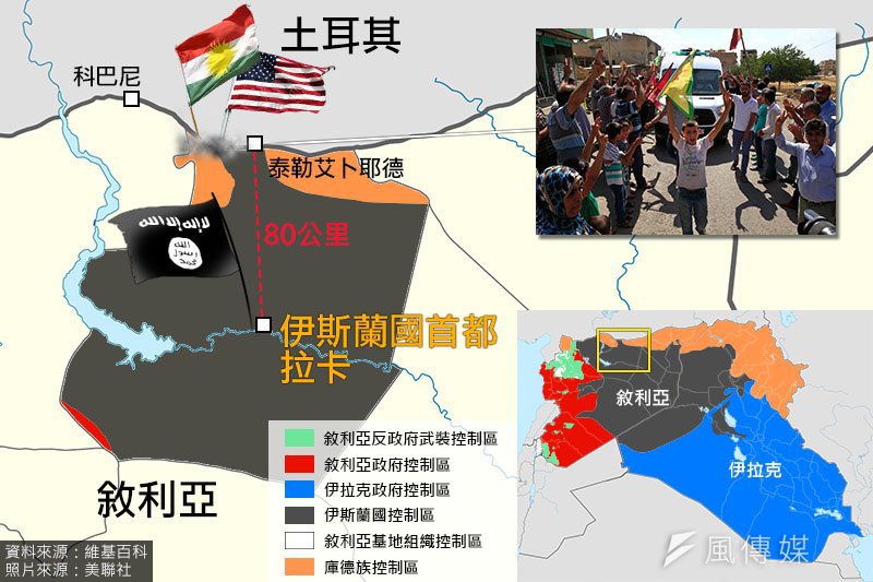 就在伊斯蘭國(Islamic State, IS)兵臨伊拉克首都巴格達之際,土耳其庫德族(Kurds)15日傍晚在美軍空襲的掩護下,攻克了敘利亞北方的戰略據點泰勒艾卜耶德(Tal Abyad),距離IS宣稱的首都拉卡(Raqqa)僅80公里,泰勒艾卜耶德為IS的重要補給中繼站,現落入庫德族手中,形同首都補給線暫時遭截斷。