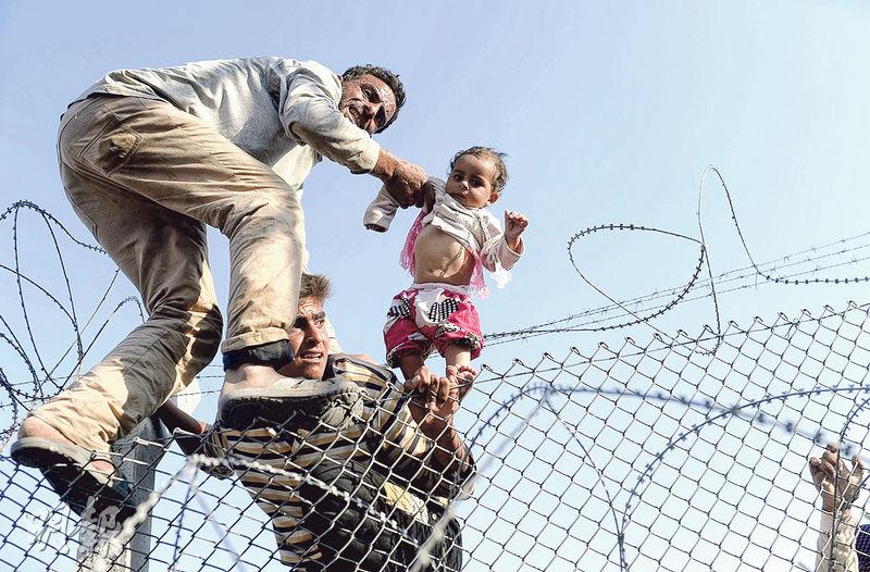 6月14日,有敘利亞難民冒險帶同幼子攀過邊境的鐵絲網,逃進土耳其阿克恰卡萊。(法新社)