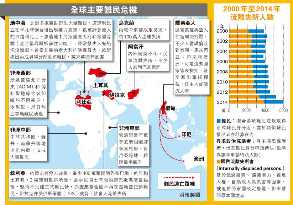 【明報專訊】今天是世界難民日,聯合國難民署(UNHCR)最新報告指,2014年全球有5950萬人被迫流離失所,見歷史新高,反映戰亂、天災和政治迫害的影響如何深遠。可是在難民危機深重之際,部分以往收容不少難民的國家卻漸感不勝負荷,開始爆發拒收潮,並以各種手段加強阻攔他國難民湧至,引發更多悲劇。國際特赦批評,國際社會對難民的「忽視密謀」令危機雪上加霜。