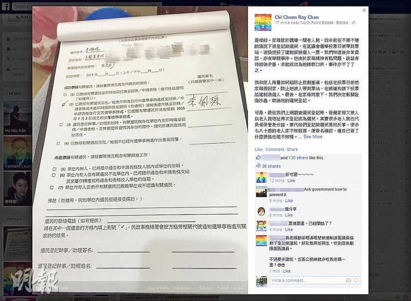 陳志全喺facebook透露居於老人院嘅媽媽,再被人用老人院地址登記做選民,佢話已經趁民政事務處嘅工作人員到訪老人院,幫媽媽處理選民登記嘅問題。(陳志全facebook)