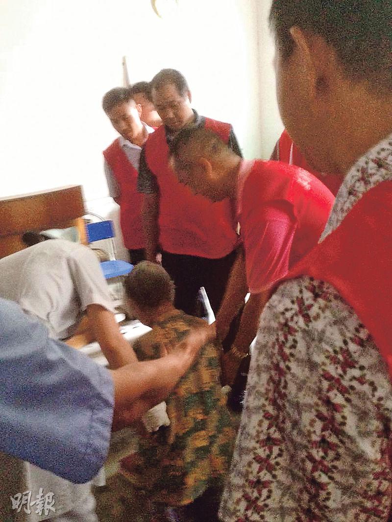 許多受助者不願意離開,部分行動不便的老人被幾個人一起強行抬走。(明報圖片)