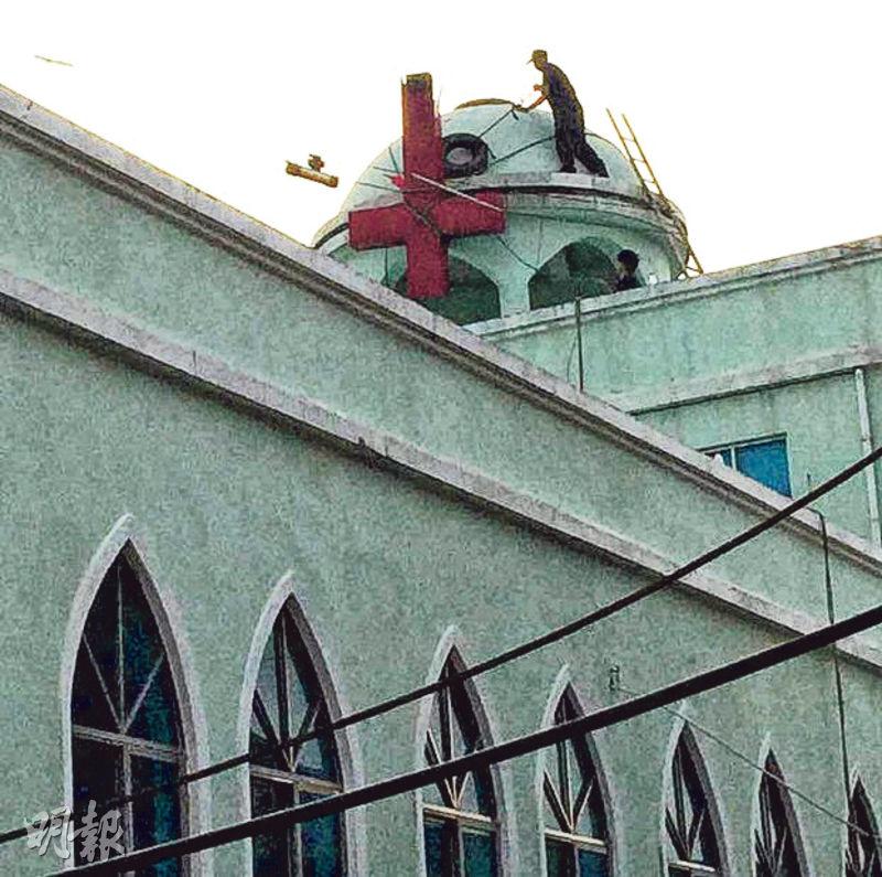 【明報專訊】浙江溫嶺市東海教堂的十字架前日遭警方強拆,多名教徒反抗時受傷。這是當地118座教堂中最後一座被拆十字架的教堂。同一天,省會杭州市兩會聖愛敬老院的十字架亦被強拆(圖)。從去年2月至今,浙江省內已有逾1200座教堂的十字架被拆除。