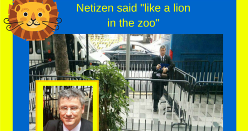 美國駐廣州副領事雖一早到達法院,但被拒諸門外,他一度更遭圍在鐵馬陣內,有網民上載圖片,慨嘆副領事似是動物園內被困的獅子。