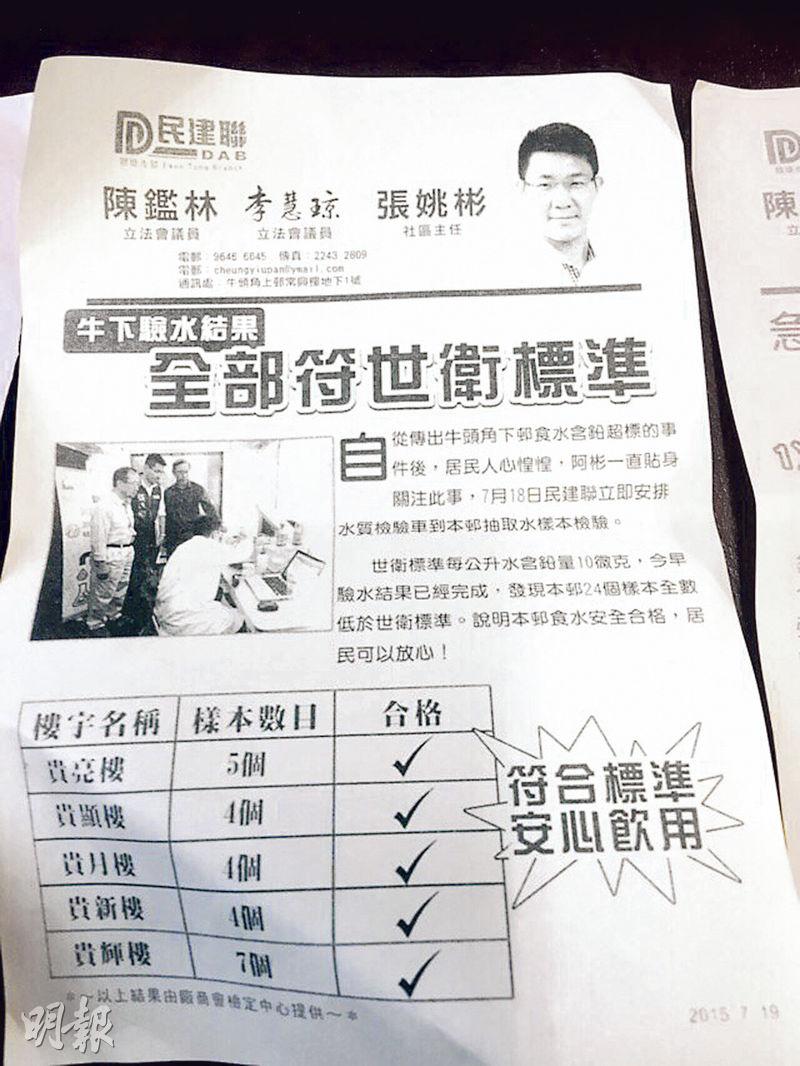 民建聯早前驗過牛頭角下邨水辦,冇發現含鉛量超標,曾派單張叫街坊安心飲用食水,點知噚日政府就話牛下有水辦含鉛超標。(網上圖片)