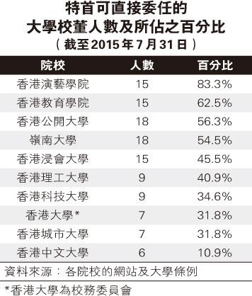 特別的是,由於現時各間院校沒有劃一的校董會架構,特首可委任的人數和佔校董會的比例皆有顯著差異。其中以中大的委任人數最少,只可委任6名,佔校董會大約一成;演藝學院則最多,可委任達15名,佔校董會逾八成,足以壟斷校政。假若特首不自我約制這些權力,大可透過不同的人事委任,把政治干預之手伸向各所院校(見表)。