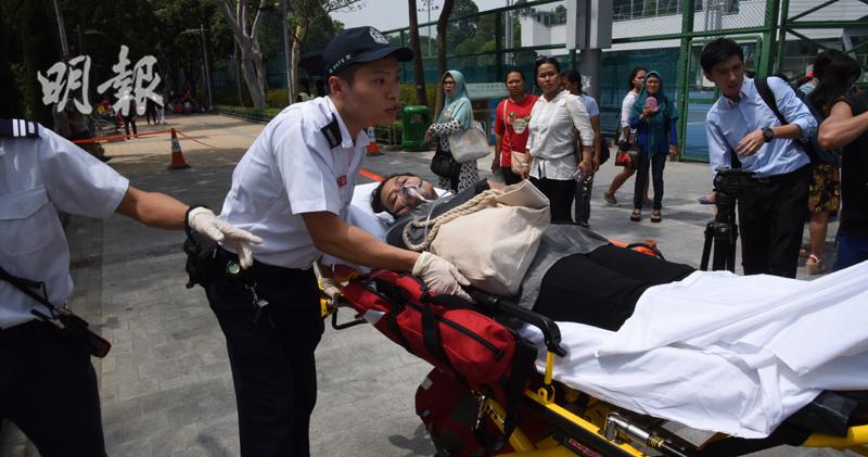 記者現場所見,有印尼女懷疑中暑暈倒後,由多名友人抱着由草地移送到設有上蓋的中央廣場內,沿途更大叫「幫手呀、幫手呀」。其中一名事主的朋友King表示,他們都有飲水,但天氣太熱,事主最終不支暈倒。