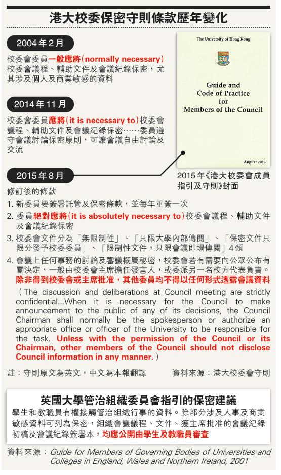 另外,本報進一步發現,港大校委守則內的保密條款,同步在8月被大幅收緊。本報偵查下取得2004年、2014年及2015年的保密守則文件,發現2004年版守則僅指校委「一般應將」(normally necessary)校委會議程、輔助文件及會議紀錄保密,到今年8月版本,已變成「絕對應將」(absolutely necessary)紀錄保密(見圖)。