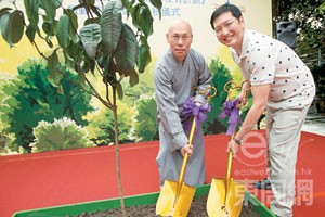 釋宏通(左)現已執掌寺中日常事務,圖為今年八月十四日,他代表寺院接受由香港迪士尼行政總裁金民豪(右)送贈樹苗。