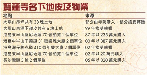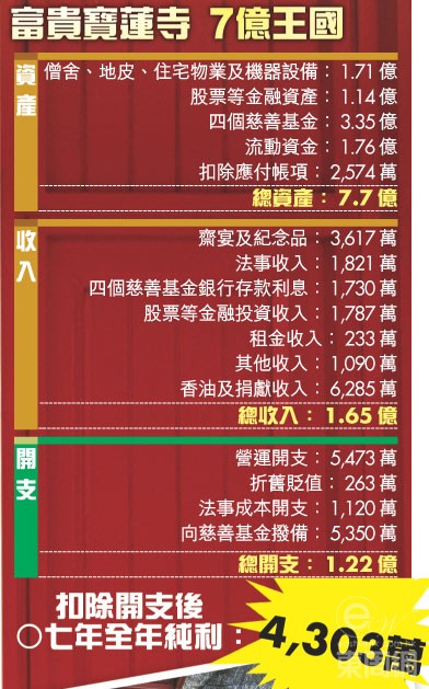 寶蓮寺這片佛門清靜地,原來富貴得令人咋舌,除了年收香油錢超過半億,炒股票每年亦有千多萬進帳,連同遍布全港的收租物業,資產總值於一年前已達七億七千萬。