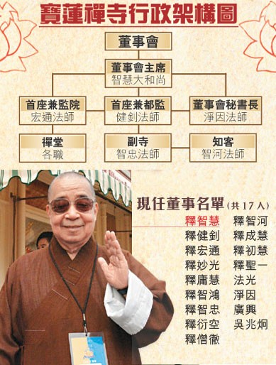 年屆七十六歲的現任住持釋智慧,三年前曾公開表示師弟釋健釗是其接班人,豈料在他決定今年底正式退休之時,突然改口欽點另一僧人釋宏通做繼任人。忽然轉軚,確實耐人尋味。