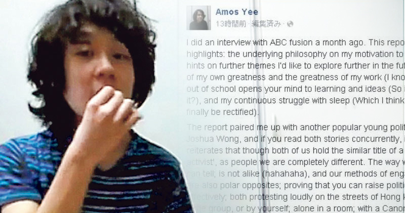 早前因拍片諷刺已故新加坡開國總理李光耀而入獄4周的16歲少年、余澎杉(Amos Yee),昨日在facebook發文回應有媒體將他與香港的黃之鋒比較,指自己與黃完全不同(completely different)。