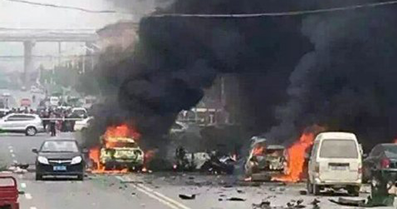 山東煙台蓬萊柳行上午8時50分發生汽車爆炸,當場造成3人死亡2人受傷。網上圖片可見,現場情況慘烈,多輛汽車、電單車被燒至只剩骨架,有死者屍體被燒焦,身體殘肢散落地面。