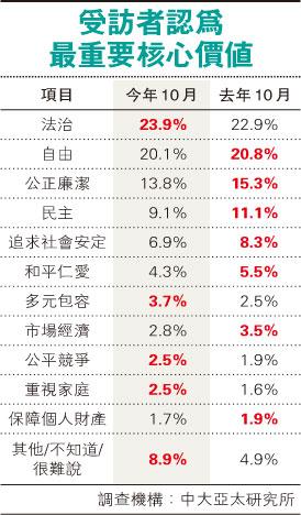 最重要核心價值 法治最多人選