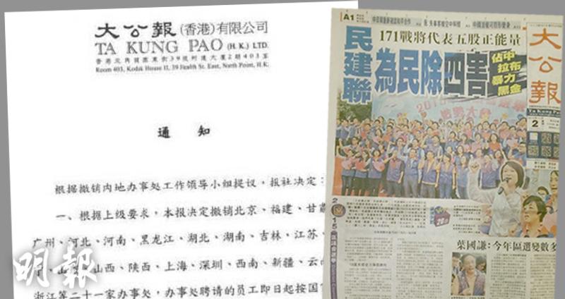 有北京傳媒人今日在微博貼出親中媒體《大公報》在上月30日的通告,指該報撤銷內地各省市21間辦事處,在內地各項業務至12月31日終止,並遣散全部辦事處員工,即日起辦理終止勞動合同手續。