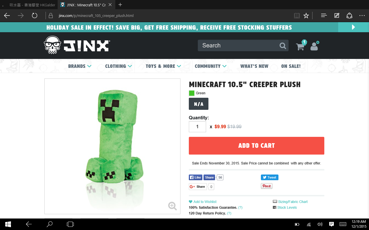 發表文章發起投票 cyber monday creeper 特價 https://www.jinx.com/p/minecraft_105_creeper_plush.html 運費仲貴過隻公仔002015/12/01, 12:37:07 凌晨本貼文共有 0 個回覆此貼文已鎖,將不接受回覆發表文章發起投票