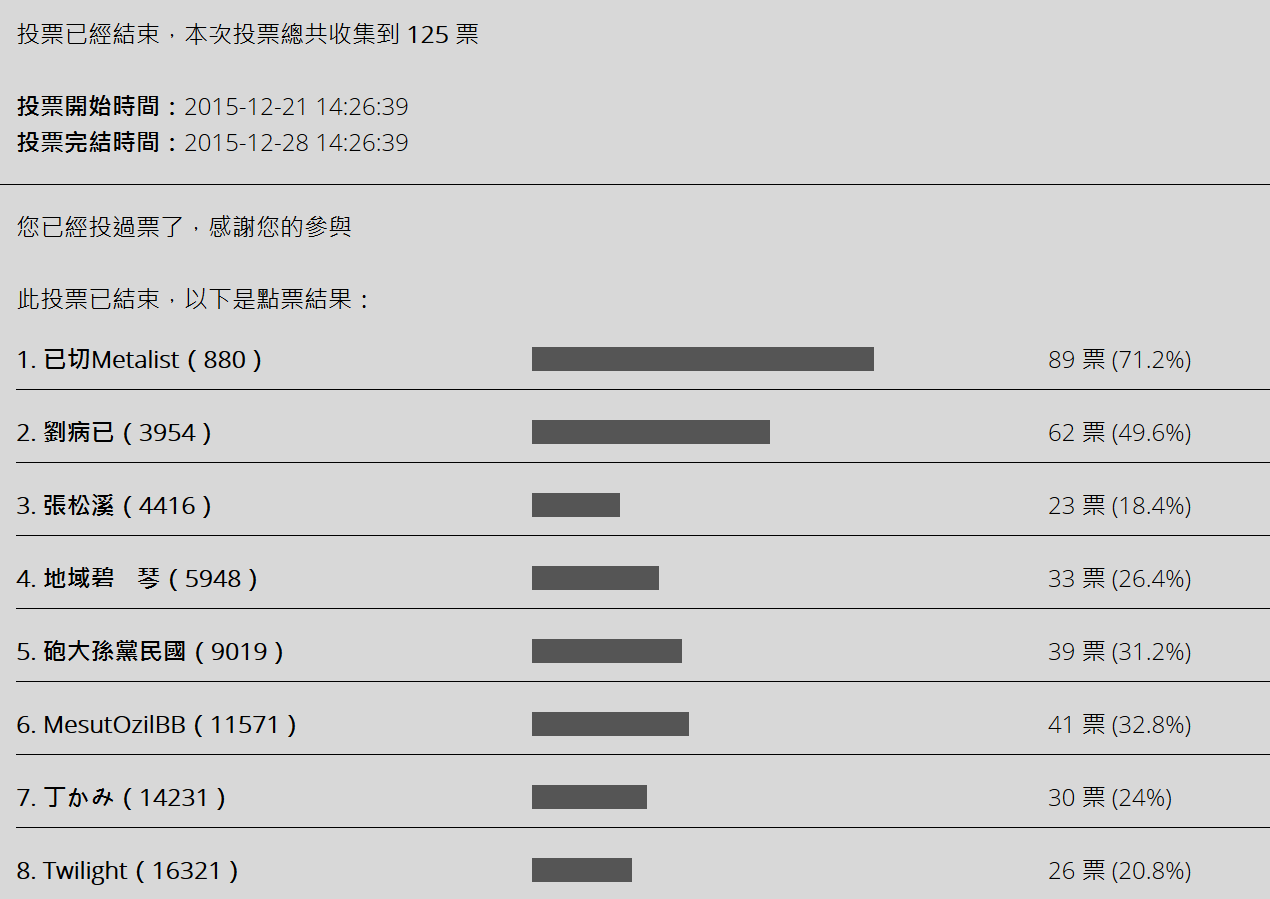 1號候選人已切Metalist (880),2號候選人劉病已 (3954)及9號候選人MesutOzilBB (11571)得票最多,成功當選