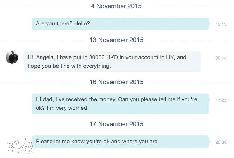 Angela指,父親去年10月17日失蹤後,其網上通訊軟件Skype帳戶長期上線,去年11月她接到其父Skype帳號發出的信息,通知已匯款予她,惟她追問父親身在何處及安全時均不獲回應,她形容信息十分神秘。另外,她從親屬口中得知,父親曾於去年12月21日,致電其中一名近親「報平安」,表示短期內不會回來。