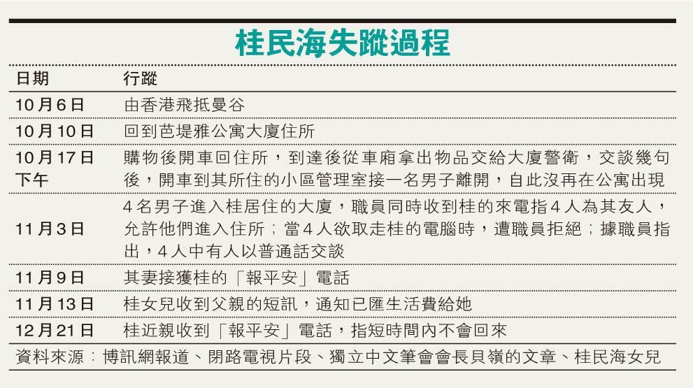 生於瑞典、現於英國留學的桂民海女兒Angela表示,在歐洲未聞類似的事,故花了許多時間才能消化父親的失蹤。她表示,與書店有關的另外4人同樣失蹤,加上父親在泰國失蹤後,所居住大廈的警衛指其父失蹤後有數名操普通話的男子到公寓上門找他,以及其他種種原因,令她無可奈何地相信父親失蹤涉及出版業務,及父親是遭中方人員綁架。
