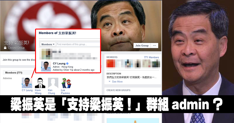 「支持梁振英!」群組有771名成員,共4個管理員,包括「Kevin Wong」、「Ken Chung」、「Loe Paskins」以及「CY Leung」,其中「CY Leung」於兩個月前被加入作管理員。群組的描述則寫上「我們全力支持梁振英!打倒黃屍,為國家出一分力」。