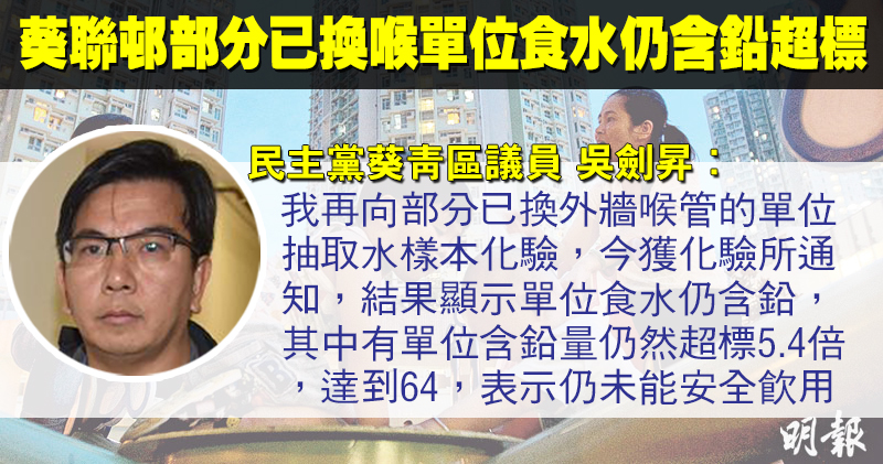 民主黨葵青區議員吳劍昇表示,葵聯邨去年7月被揭食水含鉛,政府半年後才在葵聯邨等部分受影響屋邨作試點計劃,在聯逸樓部分單位外更換外牆喉管。他其後在部分已換喉管單位抽取水樣本化驗,惟今日獲通知食水仍含鉛,有單位含鉛量更超標5.4倍。