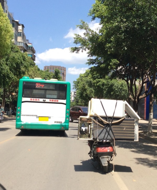竟然可以騎摩托車後面載著冰箱和冷氣機……。