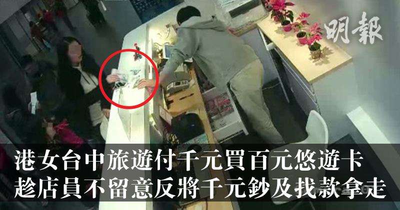 台灣是港人熱門旅遊勝地,一名朱姓女子上月底與友人到台灣旅遊,在台中機場櫃檯購買一張價值台幣100元(約25元港幣)的悠遊卡,但趁店員不留意時,將用來付款的1000元台幣(約250元港幣)和店員找續的900元台幣(約214元港幣)一起帶走。當地警方鎖定女子身分,確定她於3月初會返港,豈料她竟然在離台前「自投羅網」到櫃檯,被警方以欺詐罪拘捕。
