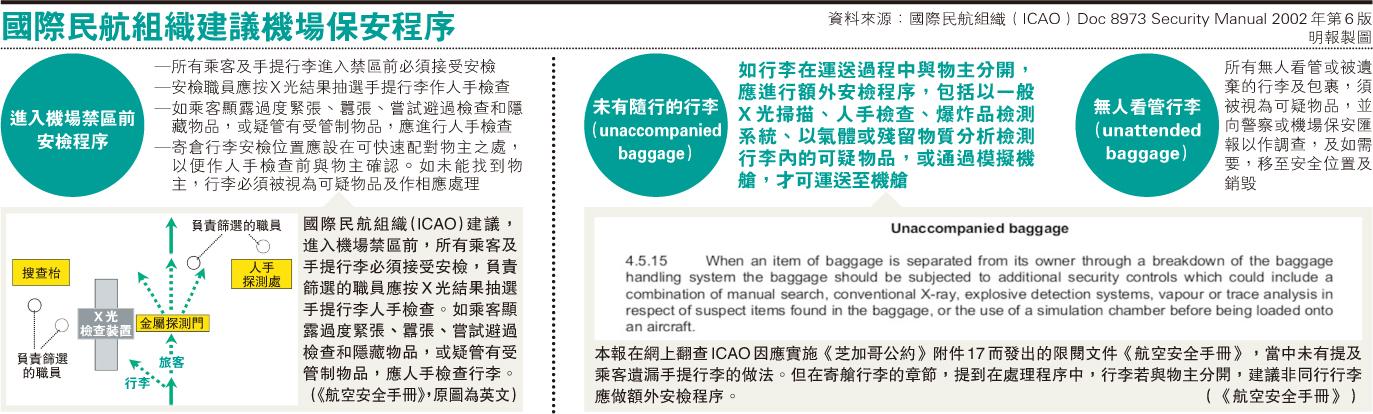 ICAO出版的《航空安全手冊》(Doc 8973)為限閱文件,載有實施《芝加哥公約》附件17建議的航空保安程序。本報在網上翻查2002年的第6版,發現在乘客與手提行李的安檢章節,有要求所有乘客及寄艙行李必須於進入禁區前安檢,但未有明文規定須同時安檢。該章節亦未有提及乘客遺漏手提行李的做法。