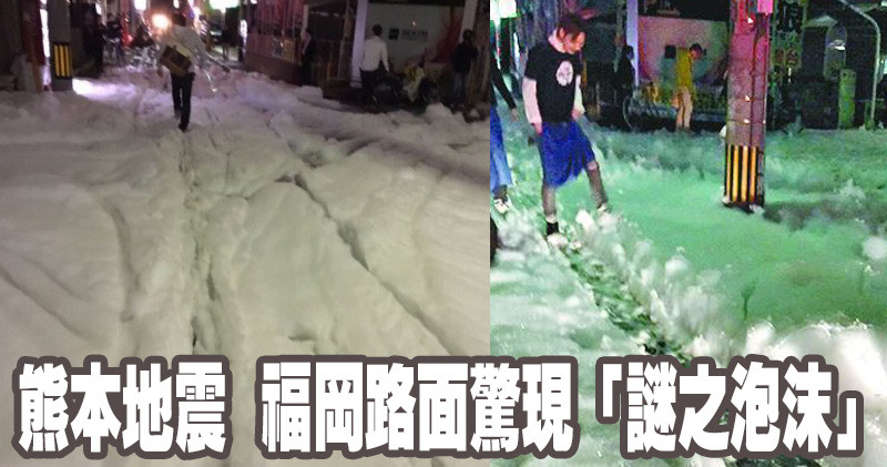發表文章發起投票熊本地震 福岡路面現「謎之泡沫」惹熱議 消防局解謎...日本九州熊本縣接連發生強烈地震,災情慘重。距離地震震央約90公里的福岡市在強震後,市內天神一帶路面出現大量白色的「謎之泡沫」,引起網民議論,疑與地震有關。不少網民紛紛分享被泡沫海淹蓋的街道的照片,可見行人都小心翼翼地在泡沫上走過,質疑這些奇怪物質是否與地震有關。有人說它像下雪後的積雪、「可以去做泡泡浴」、「好像剛開了泡泡派對」,但亦有人亦直言覺得嘔心。福岡縣消防局指,這些白色泡沫其實是滅火劑,頻繁的地震導致儲存管破裂,因此湧出路面。http://news.mingpao.com/ins/instantnews/web_tc/article/20160417/s00005/1460898243828012016/04/17, 10:37:02 晚上本貼文共有 0 個回覆此貼文已鎖,將不接受回覆發表文章發起投票