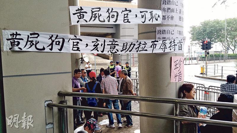 【明報專訊】昨日是梁振英最後一天到庭作供,開庭前約30名梁振英支持者在法院外,指罵黃毓民及熱血公民,亦有人手持國旗和區旗巡行,卻倒掛國旗。示威區內有人掛起「黃屍狗官,刻意助拉布辱特首」標語。珍惜群組召集人李璧而向本報承認,標語出自他們手筆,稱法官(實為裁判官)容許被告黃毓民在庭上如此囂張,「被告好似審犯咁」,反問「個法官(裁判官)係咪有問題?」但李後來又改稱,群組組織鬆散,不知標語是誰人掛上。