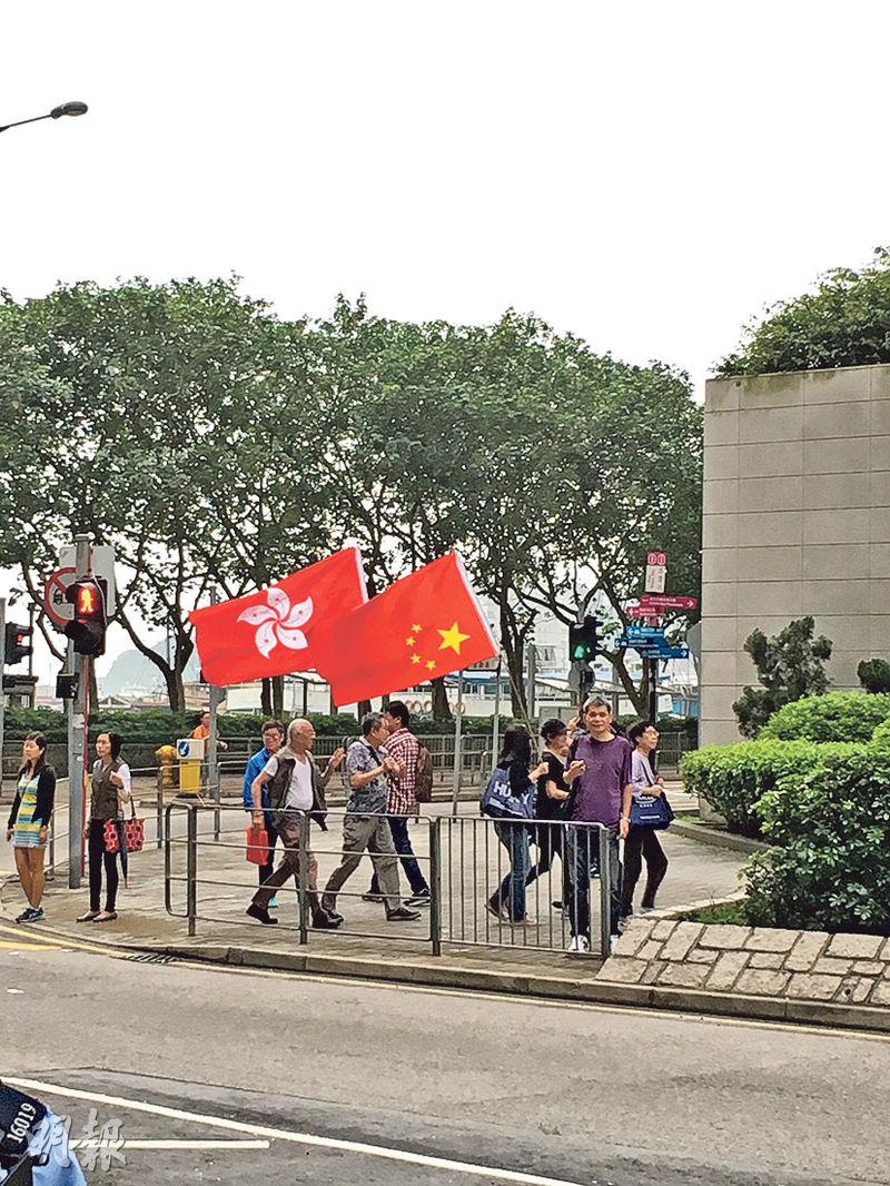 大批梁振英支持者昨到法院外示威,其間有人高舉國旗及區旗於法院外巡行,卻將國旗倒轉掛。(黃建邦攝)