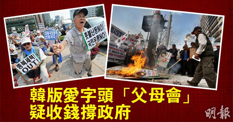 【明報專訊】「大韓民國爸媽聯合會」近年幾乎每逢出現批判政府的社會運動都會出現打對台,而且通常行動激烈、言語粗鄙。在近日報道刊出較具體證據前,韓國坊間已有懷疑該組織被收買,當政府的傳聲筒。