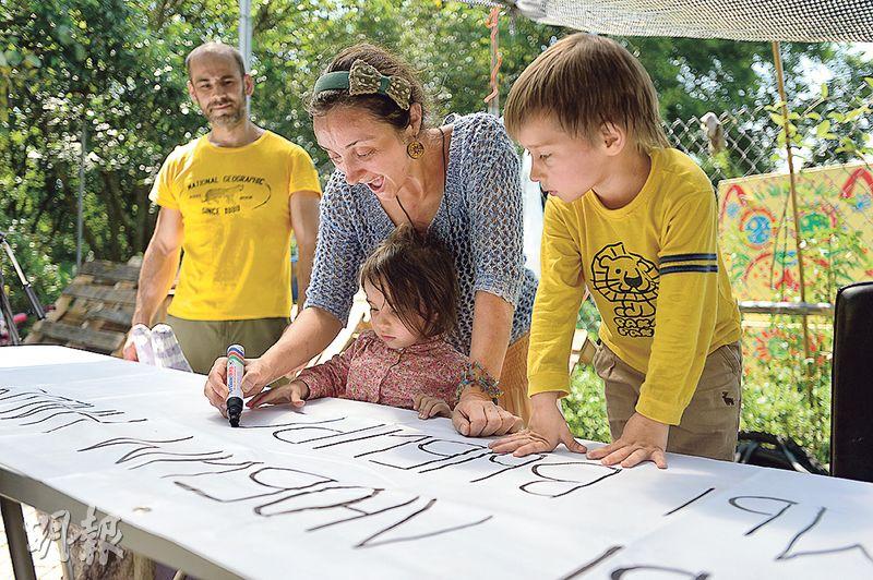 來自俄羅斯的Anna(中)認為人類需與大自然共生,她在橫額上寫上俄文,支持馬屎埔的農夫及反對地產商收地。(鄧宗弘攝)