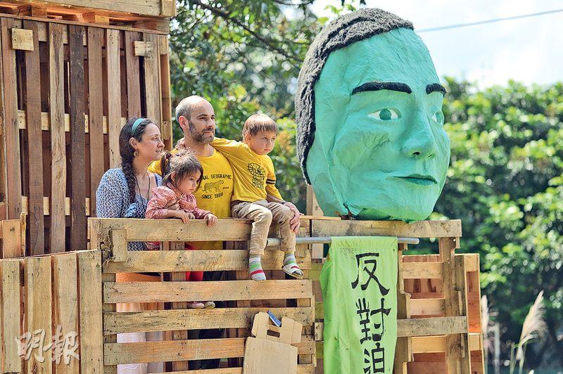 粉嶺馬屎埔有發展商收回土地時與留守的村民發生衝突。馬屎埔村民早前以卡板搭起高台以監察附近情况,並把綠色的「守田者」掛在高台上,寓意不讓壞人破壞農地。來自俄羅斯的Anna(左起)、兩歲女兒、丈夫、5歲兒子反對將農地作商業發展,加入一眾馬屎埔農夫,共同守護這片土地。(鄧宗弘攝)