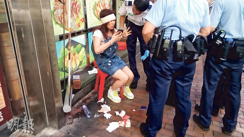 案發後,遇劫女事主在現場附近店舖外接受包紮及向警員講述案發經過。(林智傑攝)無人援手 附近店主以為情侶爭吵