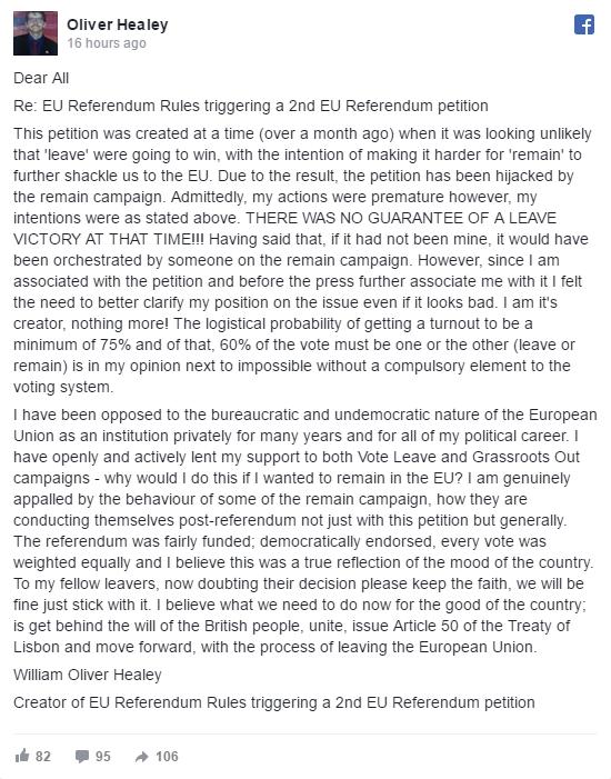 希利在facebook解釋,早在今年5月23日已發起這個重新公投的聯署,當時民調顯示英國留歐呼聲高,故他發起這個行動,希望再有機會擺脫歐盟,「當時完全不能保證脫歐會獲得勝利!」希利稱聯署最終被留歐陣營「騎劫」。