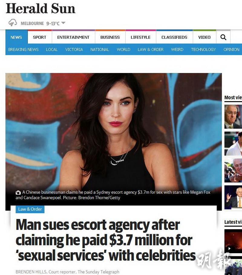 圖3之2 - 澳洲傳媒均有報道今次富商索償事件,但最無辜Angelababy等女星被捲入是非之中。(網上圖片)
