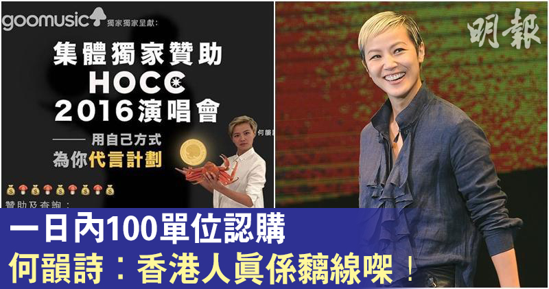 發表文章發起投票個唱贊助一日獲百單位認購 何韻詩:香港人真係黐線㗎!多謝力撐!藝人何韻詩雖遭《環球時報》點名批評而被國際品牌Lancôme(蘭蔻)取消合作,但未就此被打沉,將於10月8日至9日舉行兩場紅館演唱會。她昨日在Facebook宣布嶄新的贊助計劃《集體獨家贊助HOCC 2016演唱會——用自己方式為你代言計劃》,最低贊助門檻是每個單位15,000元,首輪先開放50個贊助單位,歡迎本地中小企及個別人士參與。計劃公布後,何韻詩今天凌晨即在Facebook宣布,一日內已經有100個單位認購,感歎道:「香港人真係痴(黐)線㗎!感謝感謝感謝,我會用最狠的勁雙倍回贈俾(畀)大家。多謝力撐!!!!!!!!!!!!」http://news.mingpao.com/ins/instantnews/web_tc/article/20160714/s00001/1468454028313佢咁受歡迎架咩??132016/07/14, 5:02:56 下午本貼文共有 0 個回覆此貼文已鎖,將不接受回覆發表文章發起投票