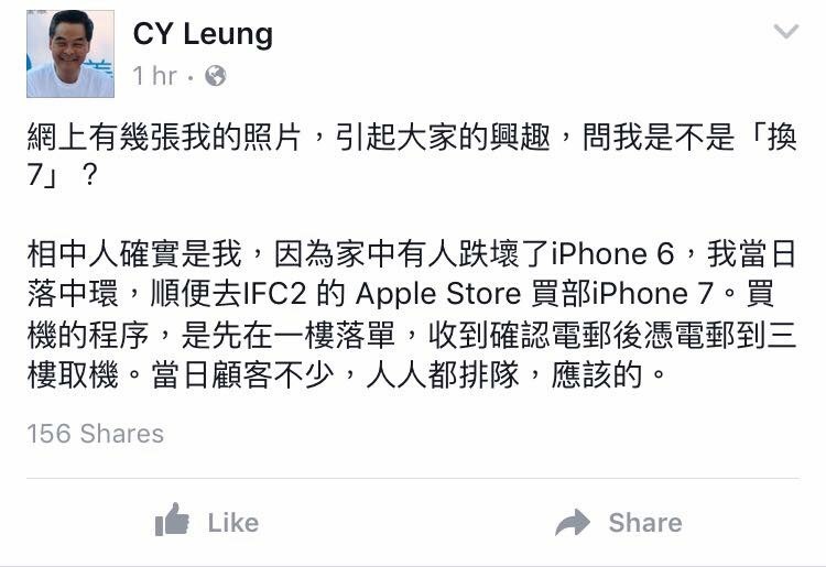 發表文章發起投票梁振英FB:網上有幾張我的照片,引起大家的興趣,問我是不是「換7」? 網上有幾張我的照片,引起大家的興趣,問我是不是「換7」? 相中人確實是我,因為家中有人跌壞了iPhone 6,我當日落中環,順便去IFC2 的 Apple Store 買部iPhone 7。買機的程序,是先在一樓落單,收到確認電郵後憑電郵到三樓取機。當日顧客不少,人人都排隊,應該的。0102016/10/05, 5:04:12 下午本貼文共有 0 個回覆此貼文已鎖,將不接受回覆發表文章發起投票
