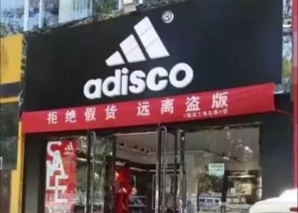 【on.cc東網專訊】 內地山寨貨橫行,大家有沒有見過明目張膽賣假貨的人,叫顧客遠離翻版的荒謬之言?網上近日熱傳一張照片,相中一間內地運動舖「adisco」,在店門前掛上口號為「拒絕假貨 遠離盜版」的紅色橫額。